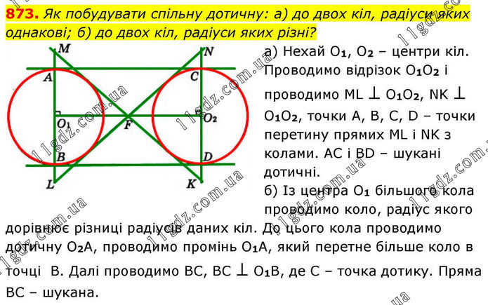 Як побудувати спільну дотичну: а) до двох кіл, радіуси яких однакові; б) до двох кіл, радіуси яких різні? а) Нехай О1, О2 – центри кіл. Проводимо відрізок О1О2 і проводимо ML ⊥ O1O2, NK ⊥ O1O2, точки А, В, С, D – точки перетину прямих ML i NK з колами. АС і BD – шукані дотичні. б) Із центра О1 більшого кола проводимо коло, радіус якого дорівнює різниці радіусів даних кіл. До цього кола проводимо дотичну О2А, проводимо промінь О1А, який перетне більше коло в точці В. Далі проводимо ВС, ВС ⊥ О1В, де С – точка дотику. Пряма ВС – шукана.