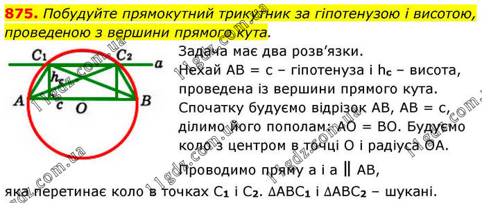 Побудуйте прямокутний трикутник за гіпотенузою і висотою, проведеною з вершини прямого кута. Задача має два розв’язки. Нехай АВ = с – гіпотенуза і hc – висота, проведена із вершини прямого кута. Спочатку будуємо відрізок АВ, АВ = с, ділимо його пополам: АО = ВО. Будуємо коло з центром в точці О і радіуса ОА. Проводимо пряму а і а ∥ АВ, яка перетинає коло в точках С1 і С2. ∆АВС1 і ∆АВС2 – шукані.