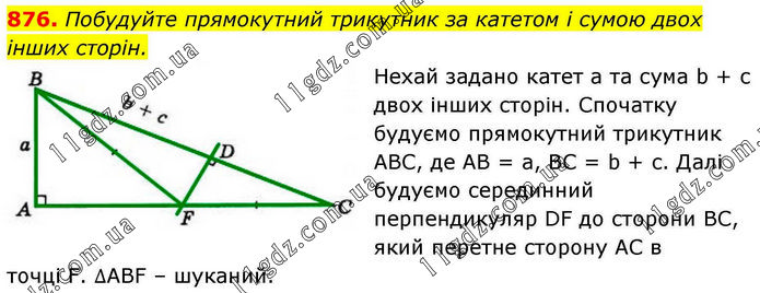Побудуйте прямокутний трикутник за катетом і сумою двох інших сторін. Нехай задано катет а та сума b + c двох інших сторін. Спочатку будуємо прямокутний трикутник АВС, де АВ = а, ВС = b + c. Далі будуємо серединний перпендикуляр DF до сторони ВС, який перетне сторону АС в точці F. ∆ABF – шуканий.