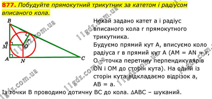Побудуйте прямокутний трикутник за катетом і радіусом вписаного кола. Нехай задано катет а і радіус вписаного кола r прямокутного трикутника. Будуємо прямий кут А, вписуємо коло радіуса r в прямий кут А (АМ = AN = r, O – точка перетину перпендикулярів ON і ОМ до сторін кута). На одній із сторін кута відкладаємо відрізок а, АВ = а. Із точки В проводимо дотичну ВС до кола. ∆АВС – шуканий.