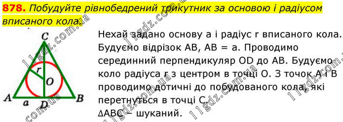 Побудуйте рівнобедрений трикутник за основою і радіусом вписаного кола. Нехай задано основу а і радіус r вписаного кола. Будуємо відрізок АВ, АВ = а. Проводимо серединний перпендикуляр OD до АВ. Будуємо коло радіуса r з центром в точці О. З точок А і В проводимо дотичні до побудованого кола, які перетнуться в точці С. ∆АВС – шуканий.