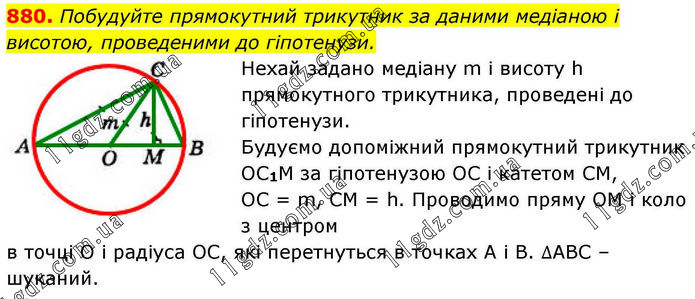 Побудуйте прямокутний трикутник за даними медіаною і висотою, проведеними до гіпотенузи. Нехай задано медіану m і висоту h прямокутного трикутника, проведені до гіпотенузи. Будуємо допоміжний прямокутний трикутник ОС1М за гіпотенузою ОС і катетом СМ, ОС = m, CM = h. Проводимо пряму ОМ і коло з центром в точці О і радіуса ОС, які перетнуться в точках А і В. ∆АВС – шуканий.