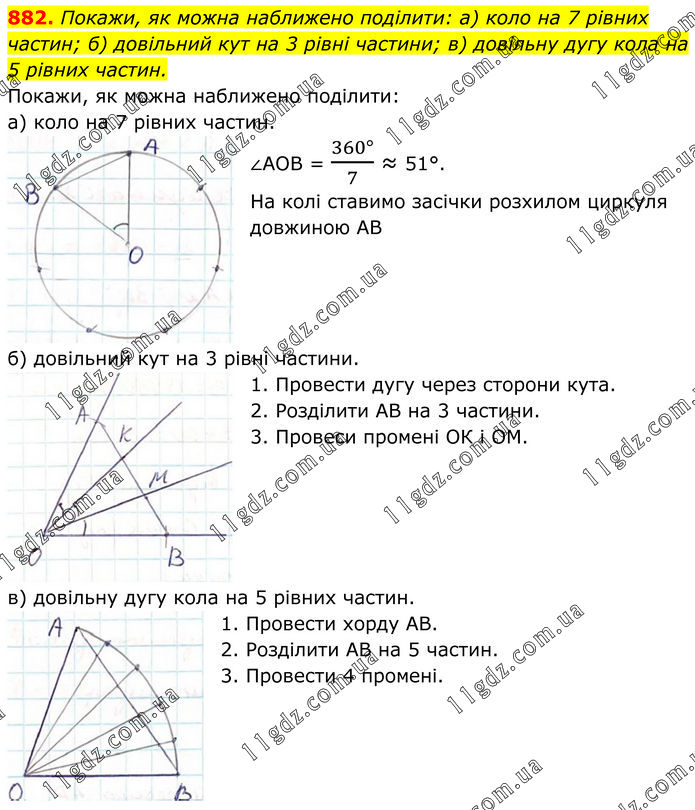 Покажи, як можна наближено поділити: а) коло на 7 рівних частин; б) довільний кут на 3 рівні частини; в) довільну дугу кола на 5 рівних частин. Покажи, як можна наближено поділити: а) коло на 7 рівних частин. ∠АОВ = (360°)/7 ≈ 51°. На колі ставимо засічки розхилом циркуля довжиною АВ. б) довільний кут на 3 рівні частини. 1. Провести дугу через сторони кута. 2. Розділити АВ на 3 частини. 3. Провеси промені ОК і ОМ. в) довільну дугу кола на 5 рівних частин. 1. Провести хорду АВ. 2. Розділити АВ на 5 частин. 3. Провести 4 промені.