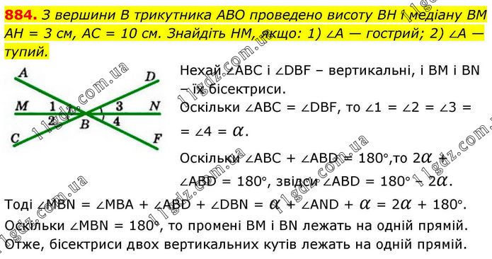 З вершини В трикутника ABO проведено висоту BH і медіану BM AH = 3 см, AC = 10 см. Знайдіть HM, якщо: 1) ∠A — гострий; 2) ∠A — тупий. Нехай ∠АВС і ∠DBF – вертикальні, і ВМ і ВN – їх бісектриси. Оскільки ∠АВС = ∠DBF, то ∠1 = ∠2 = ∠3 = ∠4 = α. Оскільки ∠АВС + ∠ABD = 180°,то 2α + ∠ABD = 180°, звідси ∠ABD = 180° – 2α. Тоді ∠MВN = ∠MBA + ∠ABD + ∠DBN = α + ∠AND + α = 2α + 180°. Оскільки ∠MВN = 180°, то промені ВМ і ВN лежать на одній прямій. Отже, бісектриси двох вертикальних кутів лежать на одній прямій.