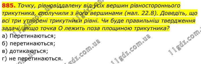 Точку, рівновіддалену від усіх вершин рівностороннього трикутника, сполучили з його вершинами (мал. 22.8). Доведіть, що всі три утворені трикутники рівні. Чи буде правильніш твердження задачі, якщо точка O лежить поза площиною трикутника? а) Перетинаються; б) перетинаються; в) дотикаються; г) не перетинаються.