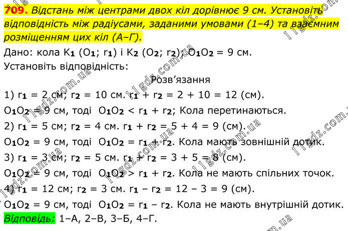 Відстань між центрами двох кіл дорівнює 9 см. Установіть відповідність між радіусами, заданими умовами (1–4) та взаємним розміщенням цих кіл (А–Г). Дано: кола K1 (O1; r1) і K2 (O2; r2); О1О2 = 9 см. Установіть відповідність: Розв’язання 1) r1 = 2 см; r2 = 10 см. r1 + r2 = 2 + 10 = 12 (см). O1O2 = 9 см, тоді O1O2 < r1 + r2; Кола перетинаються. 2) r1 = 5 см; r2 = 4 см. r1 + r2 = 5 + 4 = 9 (см). O1O2 = 9 см, тоді O1O2 = r1 + r2. Кола мають зовнішній дотик. 3) r1 = 3 см; r2 = 5 см. r1 + r2 = 3 + 5 = 8 (см). O1O2 = 9 см, тоді O1O2 > r1 + r2. Кола не мають спільних точок. 4) r1 = 12 см; r2 = 3 см. r1 – r2 = 12 – 3 = 9 (см). O1O2 = 9 см, тоді O1O2 = r1 – r2. Кола не мають внутрішній дотик. Відповідь: 1–А, 2–В, 3–Б, 4–Г.