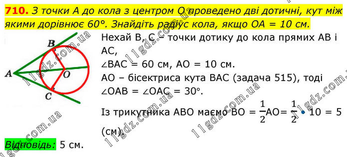 З точки А до кола з центром O проведено дві дотичні, кут між якими дорівнює 60°. Знайдіть радіус кола, якщо OA = 10 см. Нехай В, С – точки дотику до кола прямих АВ і АС, ∠ВАС = 60 см, АО = 10 см. АО – бісектриса кута ВАС (задача 515), тоді ∠ОАВ = ∠ОАС = 30°. Із трикутника АВО маємо ВО = 1/2АО= 1/2 • 10 = 5 (см). Відповідь: 5 см.