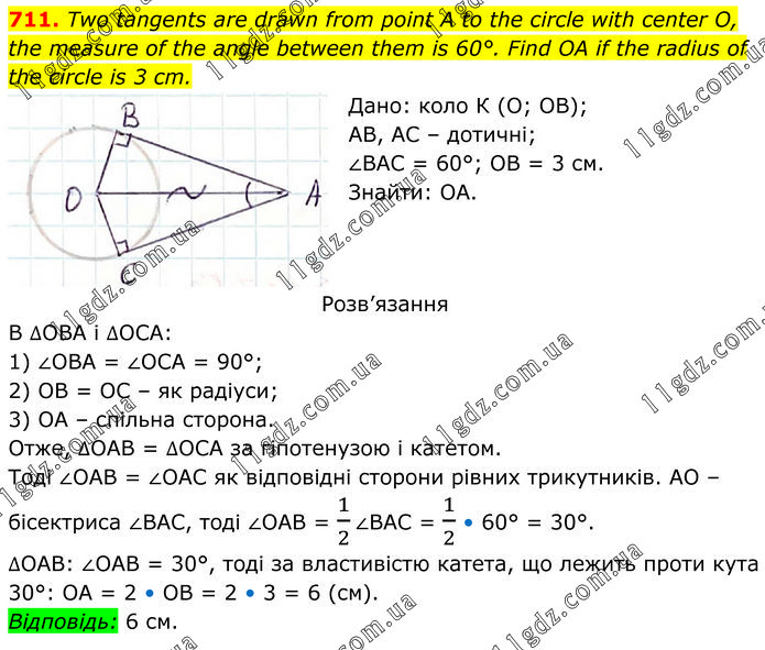 Two tangents are drawn from point A to the circle with center O, the measure of the angle between them is 60°. Find OA if the radius of the circle is 3 cm. Дано: коло К (О; ОВ); АВ, АС – дотичні; ∠ВАС = 60°; ОВ = 3 см. Знайти: ОА. Розв’язання В ∆ОВА і ∆ОСА: 1) ∠ОВА = ∠ОСА = 90°; 2) ОВ = ОС – як радіуси; 3) ОА – спільна сторона. Отже, ∆ОАВ = ∆ОСА за гіпотенузою і катетом. Тоді ∠ОАВ = ∠ОАС як відповідні сторони рівних трикутників. АО – бісектриса ∠ВАС, тоді ∠ОАВ = 1/2∠ВАС = 1/2 • 60° = 30°. ∆ОАВ: ∠ОАВ = 30°, тоді за властивістю катета, що лежить проти кута 30°: ОА = 2 • ОВ = 2 • 3 = 6 (см). Відповідь: 6 см.