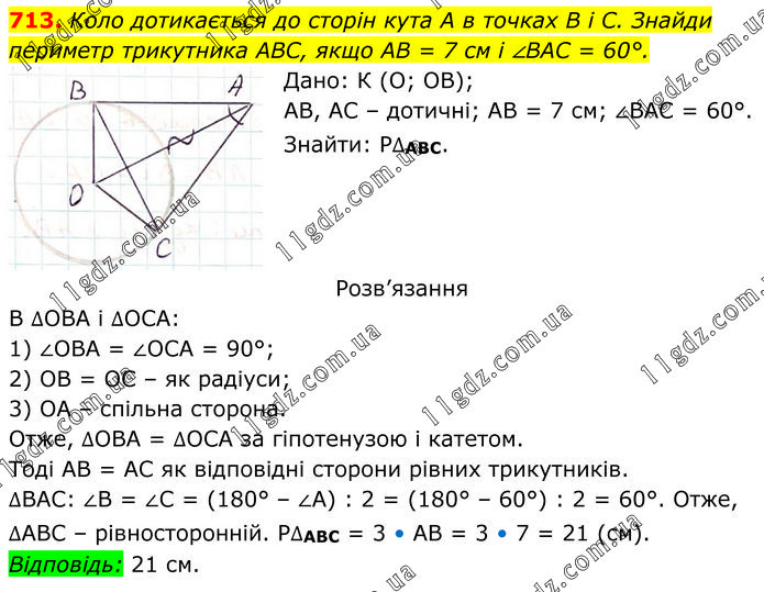 Коло дотикається до сторін кута A в точках B і C. Знайди периметр трикутника АВС, якщо AB = 7 см і ∠BAC = 60°. Дано: К (О; ОВ); АВ, АС – дотичні; АВ = 7 см; ∠ВАС = 60°. Знайти: Р∆АВС. Розв’язання В ∆ОВА і ∆ОСА: 1) ∠ОВА = ∠ОСА = 90°; 2) ОВ = ОС – як радіуси; 3) ОА – спільна сторона. Отже, ∆ОВА = ∆ОСА за гіпотенузою і катетом. Тоді АВ = АС як відповідні сторони рівних трикутників. ∆ВАС: ∠В = ∠С = (180° – ∠А) : 2 = (180° – 60°) : 2 = 60°. Отже, ∆АВС – рівносторонній. Р∆АВС = 3 • АВ = 3 • 7 = 21 (см). Відповідь: 21 см.