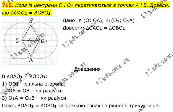 Кола із центрами O і O1 перетинаються в точках A і B. Доведи, що ΔOAO1 = ΔOBO1. Дано: К (О; ОА), К1(О1; О1А) Довести: ∆ОАО1 = ∆ОВО1. Доведення В ∆ОАО1 = ∆ОВО1: 1) ОО1 – спільна сторона; 2) ОА = ОВ – як радіуси; 3) О1А = О1В – як радіуси. Отже, ∆ОАО1 = ∆ОВО1 за третьою ознакою рівності трикутників.