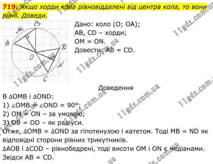 Якщо хорди кола рівновіддалені від центра кола, то вони рівні. Доведи. Дано: коло (О; ОА); АВ, CD – хорди; OM = ON. Довести: AB = CD. Доведення В ∆ОМВ і ∆OND: 1) ∠OMB = ∠OND = 90°; 2) OM = ON – за умовою; 3) OB = OD – як радіуси. Отже, ∆ОМВ = ∆OND за гіпотенузою і катетом. Тоді МВ = ND як відповідні сторони рівних трикутників. ∆АОВ і ∆COD – рівнобедрені, тоді висоти ОМ і ON є медіанами. Звідси АВ = CD.