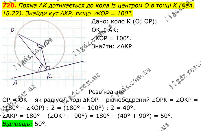 Пряма АK дотикається до кола із центром О в точці K (мал. 18.22). Знайди кут АKР, якщо ∠KOP = 100°. Дано: коло К (О; ОР); ОК ⊥ АК; ∠КОР = 100°. Знайти: ∠АКР. Розв’язання ОР = ОК – як радіуси, тоді ∆КОР – рівнобедрений: ∠ОРК = ∠ОКР = (180° – ∠КОР) : 2 = (180° – 100°) : 2 = 40°. ∠АКР = 180° – (∠ОКР + 90°) = 180° – (40° + 90°) = 50°. Відповідь: 50°.