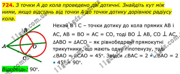 З точки А до кола проведено дві дотичні. Знайдіть кут між ними, якщо відстань від точки А до точки дотику дорівнює радіусу кола. Нехай В і С – точки дотику до кола прямих АВ і АС, АВ = ВО = АС = СО, тоді ВО ⊥ АВ, СО ⊥ АС. ∆АВО = ∆АСО – як рівнобедрені прямокутні трикутники, що мають одну гіпотенузу, тоді ∠ВАО = ∠САО = 45°. Звідси ∠ВАС = 2 • ∠ВАО = 2 • 45° = 90°. Відповідь: 90°.