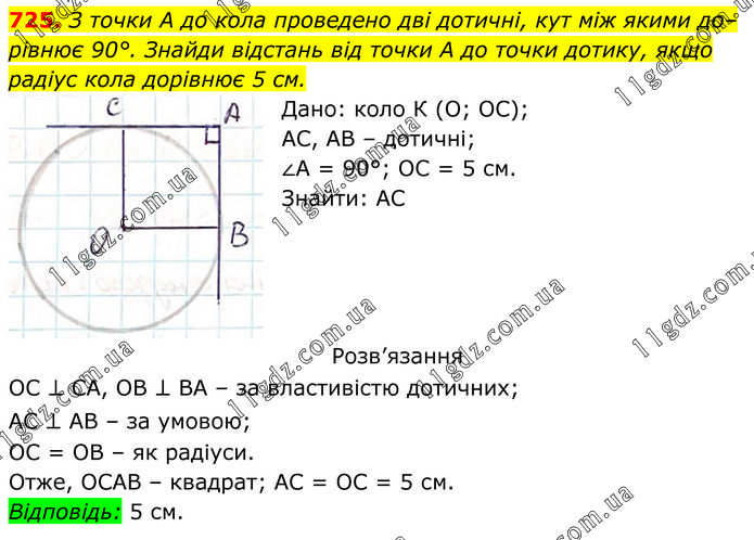 З точки A до кола проведено дві дотичні, кут між якими до–рівнює 90°. Знайди відстань від точки A до точки дотику, якщо радіус кола дорівнює 5 см. Дано: коло К (О; ОС); АС, АВ – дотичні; ∠А = 90°; ОС = 5 см. Знайти: АС Розв’язання ОС ⊥ СА, ОВ ⊥ ВА – за властивістю дотичних; АС ⊥ АВ – за умовою; ОС = ОВ – як радіуси. Отже, ОСАВ – квадрат; АС = ОС = 5 см. Відповідь: 5 см.