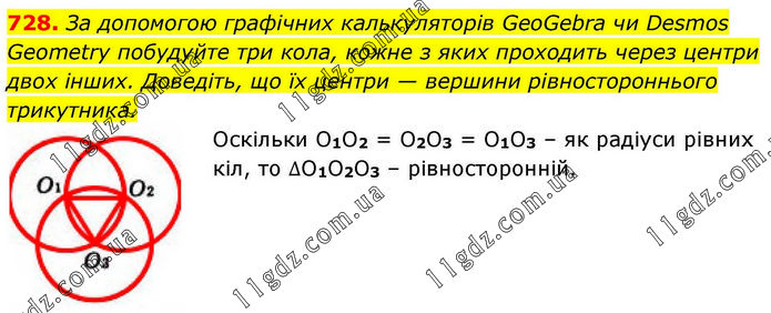 За допомогою графічних калькуляторів GeoGebra чи Desmos Geometry побудуйте три кола, кожне з яких проходить через центри двох інших. Доведіть, що їх центри — вершини рівностороннього трикутника. Оскільки О1О2 = О2О3 = О1О3 – як радіуси рівних кіл, то ∆О1О2О3 – рівносторонній.