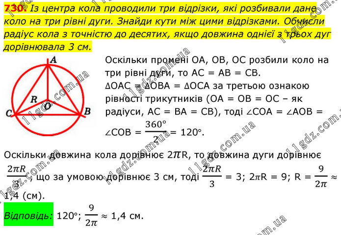 Із центра кола проводили три відрізки, які розбивали дане коло на три рівні дуги. Знайди кути між цими відрізками. Обчисли радіус кола з точністю до десятих, якщо довжина однієї з трьох дуг дорівнювала 3 см. Оскільки промені ОА, ОВ, ОС розбили коло на три рівні дуги, то АС = АВ = СВ. ∆ОАС = ∆ОВА = ∆ОСА за третьою ознакою рівності трикутників (ОА = ОВ = ОС – як радіуси, АС = ВА = СВ), тоді ∠СОА = ∠АОВ = ∠СОВ = (360°)/2 = 120°. Оскільки довжина кола дорівнює 2πR, то довжина дуги дорівнює 2πR/3, що за умовою дорівнює 3 см, тоді 2πR/3 = 3; 2πR = 9; R = 9/2π ≈ 1,4 (см). Відповідь: 120°; 9/2π ≈ 1,4 см.