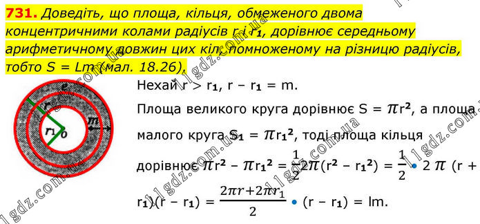 Доведіть, що площа, кільця, обмеженого двома концентричними колами радіусів r і r1, дорівнює середньому арифметичному довжин цих кіл, помноженому на різницю радіусів, тобто S = Lm (мал. 18.26). Нехай r > r1, r – r1 = m. Площа великого круга дорівнює S = πr2, а площа малого круга S1 = πr12, тоді площа кільця дорівнює πr2 – πr12 = 1/22π(r2 – r12) = 1/2 • 2 π (r + r1)(r – r1) = (2πr+2πr_1)/2 • (r – r1) = lm.