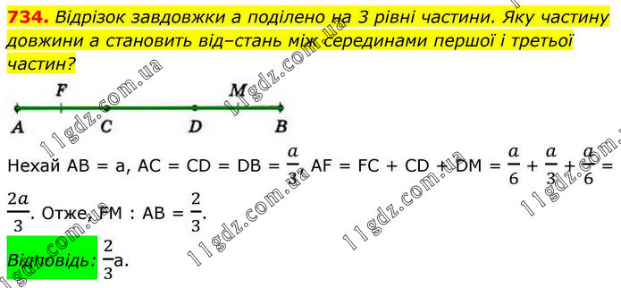 Відрізок завдовжки а поділено на 3 рівні частини. Яку частину довжини а становить від–стань між серединами першої і третьої частин? Нехай АВ = а, АС = СD = DB = a/3, AF = FC + CD + DM = a/6 + a/3 + a/6 = 2a/3. Отже, FM : AB = 2/3. Відповідь: 2/3а.