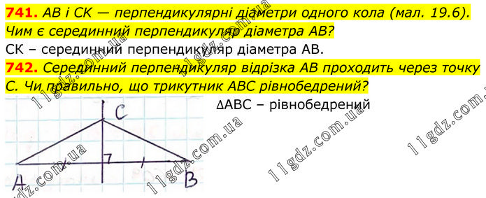 741. AB і CK — перпендикулярні діаметри одного кола (мал. 19.6). Чим є серединний перпендикуляр діаметра AB? СК – серединний перпендикуляр діаметра АВ. 742. Серединний перпендикуляр відрізка AB проходить через точку C. Чи правильно, що трикутник ABC рівнобедрений? ∆АВС – рівнобедрений.