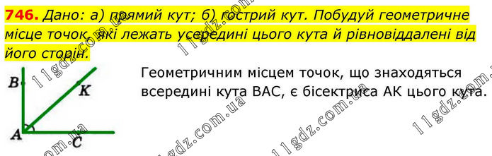 Дано: а) прямий кут; б) гострий кут. Побудуй геометричне місце точок, які лежать усередині цього кута й рівновіддалені від його сторін. Геометричним місцем точок, що знаходяться всередині кута ВАС, є бісектриса АК цього кута.