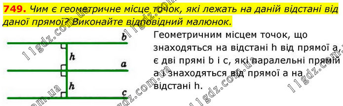 Чим є геометричне місце точок, які лежать на даній відстані від даної прямої? Виконайте відповідний малюнок. Геометричним місцем точок, що знаходяться на відстані h від прямої а, є дві прямі b і с, які паралельні прямій а і знаходяться від прямої а на відстані h.