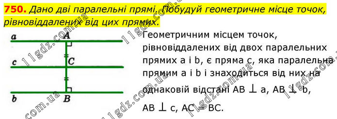 Дано дві паралельні прямі. Побудуй геометричне місце точок, рівновіддалених від цих прямих. Геометричним місцем точок, рівновіддалених від двох паралельних прямих а і b, є пряма с, яка паралельна прямим а і b і знаходиться від них на однаковій відстані АВ ⊥ а, АВ ⊥ b, АВ ⊥ с, АС = ВС.