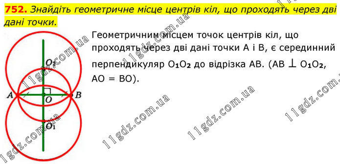 Знайдіть геометричне місце центрів кіл, що проходять через дві дані точки. Геометричним місцем точок центрів кіл, що проходять через дві дані точки А і В, є серединний перпендикуляр О1О2 до відрізка АВ. (АВ ⊥ О1О2, АО = ВО).
