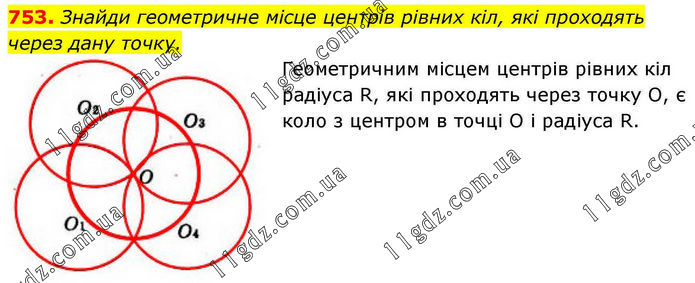 Знайди геометричне місце центрів рівних кіл, які проходять через дану точку. Геометричним місцем центрів рівних кіл радіуса R, які проходять через точку О, є коло з центром в точці О і радіуса R.