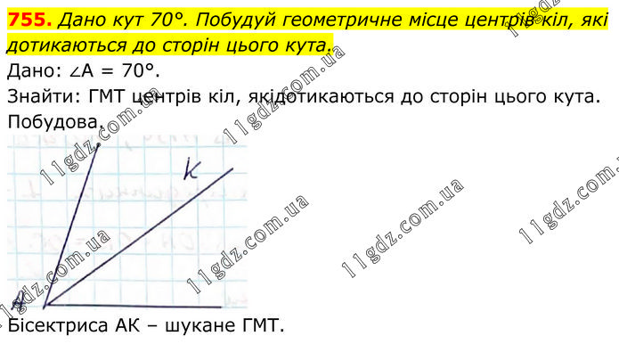 Дано кут 70°. Побудуй геометричне місце центрів кіл, які дотикаються до сторін цього кута. Дано: ∠А = 70°. Знайти: ГМТ центрів кіл, якідотикаються до сторін цього кута. Побудова. Бісектриса АК – шукане ГМТ.