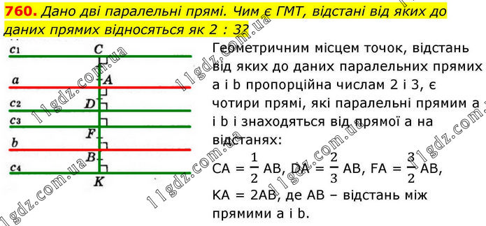 Дано дві паралельні прямі. Чим є ГМТ, відстані від яких до даних прямих відносяться як 2 : 3? Геометричним місцем точок, відстань від яких до даних паралельних прямих а і b пропорційна числам 2 і 3, є чотири прямі, які паралельні прямим а і b і знаходяться від прямої а на відстанях: СА = 1/2АВ, DA = 2/3AB, FA = 3/2AB, KA = 2AB, де АВ – відстань між прямими а і b.