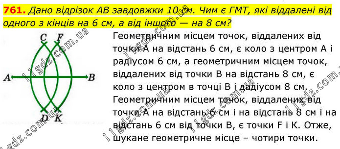 Дано відрізок AB завдовжки 10 см. Чим є ГМТ, які віддалені від одного з кінців на 6 см, а від іншого — на 8 см? Геометричним місцем точок, віддалених від точки А на відстань 6 см, є коло з центром А і радіусом 6 см, а геометричним місцем точок, віддалених від точки В на відстань 8 см, є коло з центром в точці В і дадіусом 8 см. Геометричним місцем точок, віддалених від точки А на відстань 6 см і на відстань 8 см і на відстань 6 см від точки В, є точки F і К. Отже, шукане геометричне місце – чотири точки.