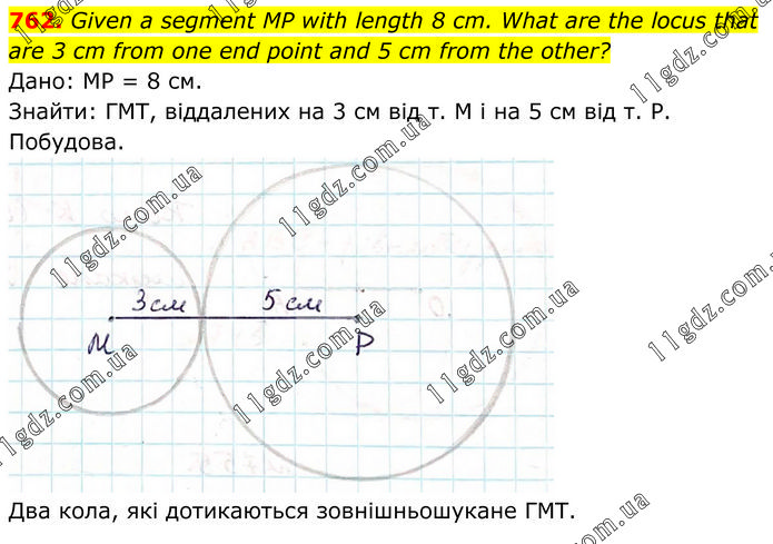 Given a segment MP with length 8 cm. What are the locus that are 3 cm from one end point and 5 cm from the other? Дано: МР = 8 см. Знайти: ГМТ, віддалених на 3 см від т. М і на 5 см від т. Р. Побудова. Два кола, які дотикаються зовнішньошукане ГМТ.