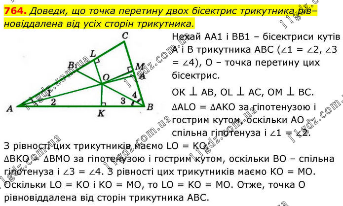 Доведи, що точка перетину двох бісектрис трикутника рівновіддалена від усіх сторін трикутника. Нехай АА1 і ВВ1 – бісектриси кутів А і В трикутника АВС (∠1 = ∠2, ∠3 = ∠4), О – точка перетину цих бісектрис. ОК ⊥ АВ, OL ⊥ АС, ОМ ⊥ ВС. ∆ALO = ∆AKO за гіпотенузою і гострим кутом, оскільки АО – спільна гіпотенуза і ∠1 = ∠2. З рівності цих трикутників маємо LO = KO. ∆BKO = ∆BMO за гіпотенузою і гострим кутом, оскільки ВО – спільна гіпотенуза і ∠3 = ∠4. З рівності цих трикутників маємо КО = МО. Оскільки LO = KO і KO = MO, то LO = KO = MO. Отже, точка О рівновіддалена від сторін трикутника АВС.