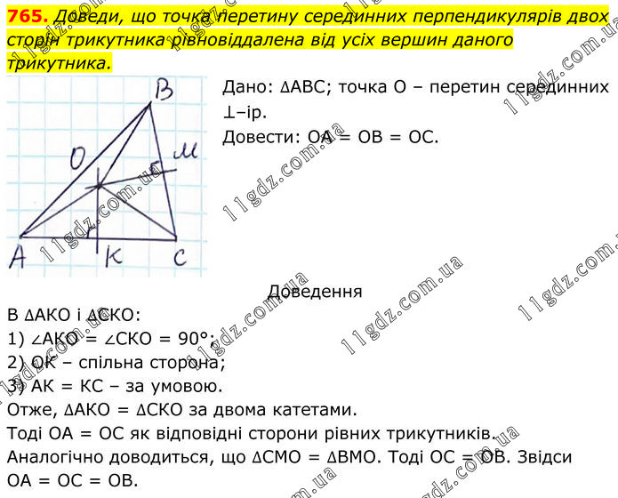 Доведи, що точка перетину серединних перпендикулярів двох сторін трикутника рівновіддалена від усіх вершин даного трикутника. Дано: ∆АВС; точка О – перетин серединних ⊥–ір. Довести: ОА = ОВ = ОС. Доведення В ∆АКО і ∆СКО: 1) ∠АКО = ∠СКО = 90°; 2) ОК – спільна сторона; 3) АК = КС – за умовою. Отже, ∆АКО = ∆СКО за двома катетами. Тоді ОА = ОС як відповідні сторони рівних трикутників. Аналогічно доводиться, що ∆СМО = ∆ВМО. Тоді ОС = ОВ. Звідси ОА = ОС = ОВ.