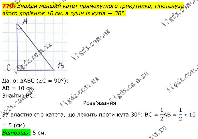 Знайди менший катет прямокутного трикутника, гіпотенуза якого дорівнює 10 см, а один із кутів — 30°. Дано: ∆АВС (∠С = 90°); АВ = 10 см. Знайти: ВС. Розв’язання За властивістю катета, що лежить проти кута 30°: ВС = 1/2АВ = 1/2 • 10 = 5 (см). Відповідь: 5 см.