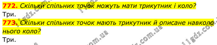 772. Скільки спільних точок можуть мати трикутник і коло? Три. 773. Скільки спільних точок мають трикутник й описане навколо нього коло? Три.