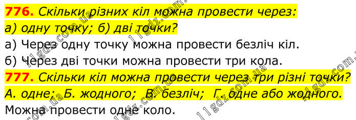 776. Скільки різних кіл можна провести через: а) одну точку; б) дві точки? а) Через одну точку можна провести безліч кіл. б) Через дві точки можна провести три кола. 777. Скільки кіл можна провести через три різні точки? А. одне; Б. жодного; В. безліч; Г. одне або жодного. Можна провести одне коло.