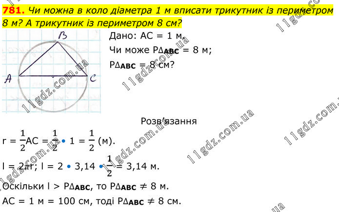 Чи можна в коло діаметра 1 м вписати трикутник із периметром 8 м? А трикутник із периметром 8 см? Дано: АС = 1 м. Чи може Р∆АВС = 8 м; Р∆АВС = 8 см? Розв’язання r = 1/2AC = 1/2 • 1 = 1/2 (м). l = 2πr; l = 2 • 3,14 • 1/2 = 3,14 м. Оскільки l > P∆ABC, то P∆ABC ≠ 8 м. АС = 1 м = 100 см, тоді P∆ABC ≠ 8 см.