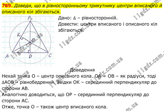Доведи, що в рівносторонньому трикутнику центри вписаного й описаного кіл збігаються. Дано: ∆ – рівносторонній. Довести: центри вписаного і описаного кіл збігаються. Доведення Нехай точка О – центр описаного кола. ОА = ОВ – як радіуси, тоді ∆АОВ – рівнобедрений. Звідки ОК – серединний перпендикуляр до сторони АВ. Аналогічно доводиться, що ОР – серединний перпендикуляр до сторони АС. Отже, точка О – також центр вписаного кола.