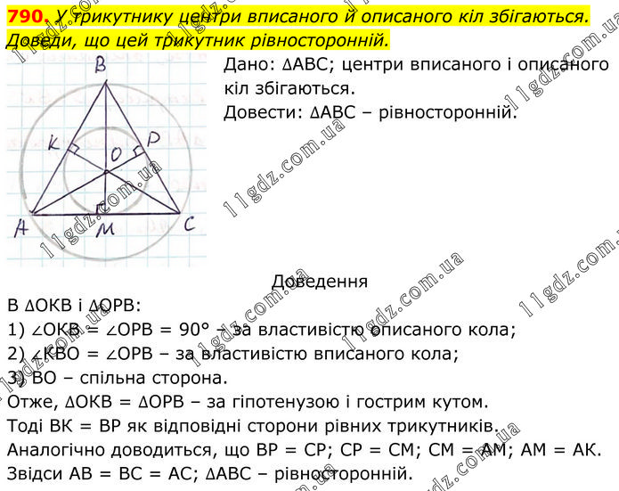 У трикутнику центри вписаного й описаного кіл збігаються. Доведи, що цей трикутник рівносторонній. Дано: ∆АВС; центри вписаного і описаного кіл збігаються. Довести: ∆АВС – рівносторонній. Доведення В ∆ОКВ і ∆ОРВ: 1) ∠ОКВ = ∠ОРВ = 90° – за властивістю описаного кола; 2) ∠КВО = ∠ОРВ – за властивістю вписаного кола; 3) ВО – спільна сторона. Отже, ∆ОКВ = ∆ОРВ – за гіпотенузою і гострим кутом. Тоді ВК = ВР як відповідні сторони рівних трикутників. Аналогічно доводиться, що ВР = СР; СР = СМ; СМ = АМ; АМ = АК. Звідси АВ = ВС = АС; ∆АВС – рівносторонній.
