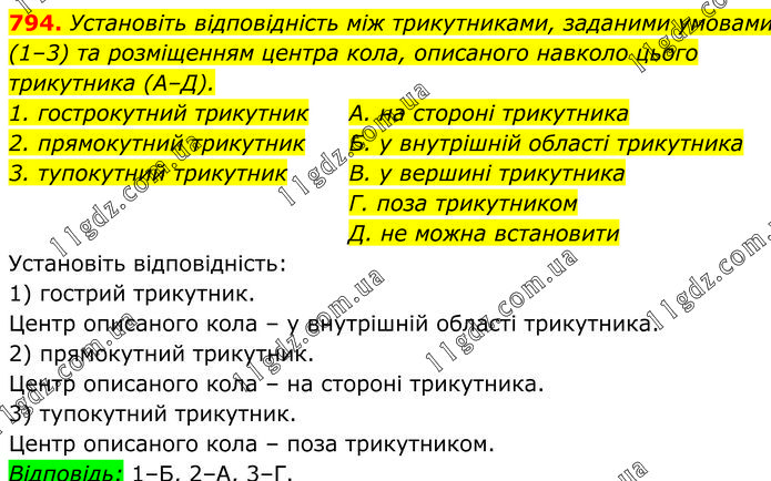 Установіть відповідність між трикутниками, заданими умовами (1–3) та розміщенням центра кола, описаного навколо цього трикутника (А–Д). 1. гострокутний трикутник 2. прямокутний трикутник 3. тупокутний трикутник А. на стороні трикутника Б. у внутрішній області трикутника В. у вершині трикутника Г. поза трикутником Д. не можна встановити Установіть відповідність: 1) гострий трикутник. Центр описаного кола – у внутрішній області трикутника. 2) прямокутний трикутник. Центр описаного кола – на стороні трикутника. 3) тупокутний трикутник. Центр описаного кола – поза трикутником. Відповідь: 1–Б, 2–А, 3–Г.