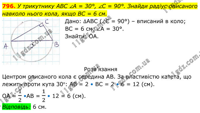 У трикутнику АВС ∠A = 30°, ∠C = 90°. Знайди радіус описаного навколо нього кола, якщо ВС = 6 см. Дано: ∆АВС (∠С = 90°) – вписаний в коло; ВС = 6 см; ∠А = 30°. Знайти: ОА. Розв’язання Центром описаного кола є середина АВ. За властивістю катета, що лежить проти кута 30°: АВ = 2 • ВС = 2 • 6 = 12 (см). ОА = 1/2 • АВ = 1/2 • 12 = 6 (см). Відповідь: 6 см.