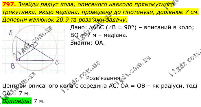 Знайди радіус кола, описаного навколо прямокутного трикутника, якщо медіана, проведена до гіпотенузи, дорівнює 7 см. Доповни малюнок 20.9 та розв’яжи задачу. Дано: ∆АВС (∠В = 90°) – вписаний в коло; ВО = 7 м – медіана. Знайти: ОА. Розв’язання Центром описаного кола є середина АС. ОА = ОВ – як радіуси, тоді ОА = 7 м. Відповідь: 7 м.