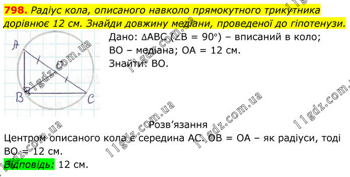 Радіус кола, описаного навколо прямокутного трикутника дорівнює 12 см. Знайди довжину медіани, проведеної до гіпотенузи. Дано: ∆АВС (∠В = 90°) – вписаний в коло; ВО – медіана; ОА = 12 см. Знайти: ВО. Розв’язання Центром описаного кола є середина АС. ОВ = ОА – як радіуси, тоді ВО = 12 см. Відповідь: 12 см.
