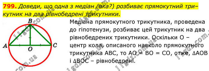Доведи, що одна з медіан (яка?) розбиває прямокутний трикутник на два рівнобедрені трикутники. Медіана прямокутного трикутника, проведена до гіпотенузи, розбиває цей трикутник на два рівнобедрених трикутники. Оскільки О – центр кола, описаного навколо прямокутного трикутника АВС, то АО = ВО = СО, отже, ∆АОВ і ∆ВОС – рівнобедрені.