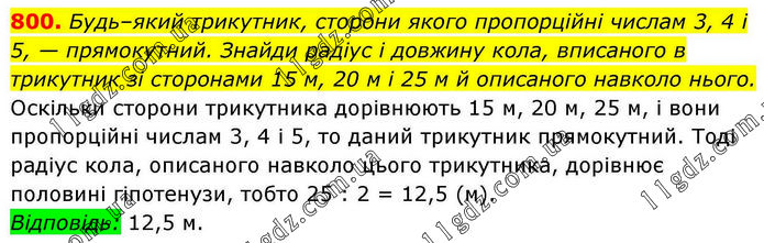 Будь–який трикутник, сторони якого пропорційні числам 3, 4 і 5, — прямокутний. Знайди радіус і довжину кола, вписаного в трикутник зі сторонами 15 м, 20 м і 25 м й описаного навколо нього. Оскільки сторони трикутника дорівнюють 15 м, 20 м, 25 м, і вони пропорційні числам 3, 4 і 5, то даний трикутник прямокутний. Тоді радіус кола, описаного навколо цього трикутника, дорівнює половині гіпотенузи, тобто 25 : 2 = 12,5 (м). Відповідь: 12,5 м.
