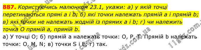 Користуючись малюнком 23.1, укажи: а) у якій точці перетинаються прямі a і b; б) які точки належать прямій a і прямій b; в) які точки не належать жодній із прямих a і b; г) чи належить точка O прямій a, прямій b. а) У точці О; б) прямій а належать точки: О, Р, Т. Прямій b належать точки: О, М, N; в) точки S і Е; г) так.
