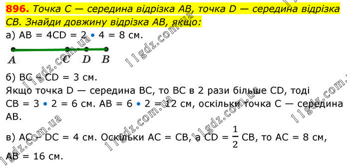 Точка C — середина відрізка AB, точка D — середина відрізка CB. Знайди довжину відрізка AB, якщо: a) AB = 4CD = 2 • 4 = 8 см. б) BC – CD = 3 см. Якщо точка D — середина BC, то BC в 2 рази більше CD, тоді CB = 3 • 2 = 6 см. AB = 6 • 2 = 12 см, оскільки точка C — середина АВ. в) AC – DC = 4 см. Оскільки AC = CB, а CD = 1/2 CB, то AC = 8 см, AB = 16 см.