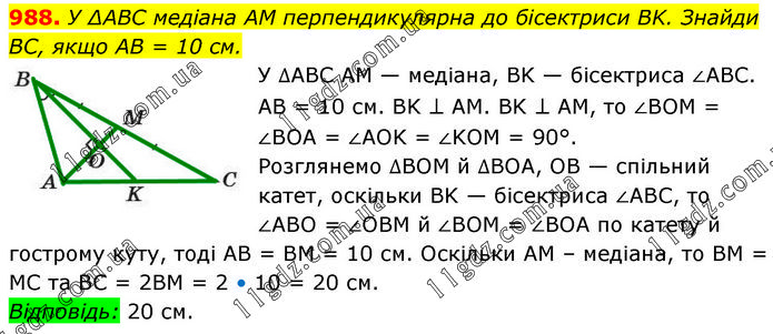 У ∆ABC медіана AM перпендикулярна до бісектриси BK. Знайди BC, якщо AB = 10 см. У ∆ABC AM — медіана, BK — бісектриса ∠ABC. AB = 10 см. BK ⊥ AM. BK ⊥ AM, то ∠BOM = ∠BOA = ∠AOK = ∠KOM = 90°. Розглянемо ∆BOM й ∆BOA, OB — спільний катет, оскільки BK — бісектриса ∠ABC, то ∠ABO = ∠OBM й ∠BOM = ∠BOA по катету й гострому куту, тоді AB = BM = 10 см. Оскільки AM – медіана, то ВМ = MC та BC = 2ВМ = 2 • 10 = 20 см. Відповідь: 20 см.