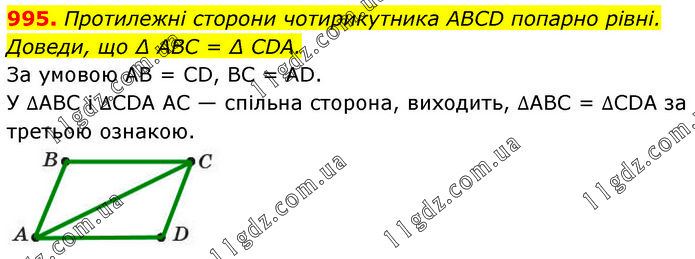 Протилежні сторони чотирикутника ABCD попарно рівні. Доведи, що ∆ABC = ∆CDA. За умовою AB = CD, BC = AD. У ∆ABC і ∆CDA AC — спільна сторона, виходить, ∆ABC = ∆CDA за третьою ознакою.